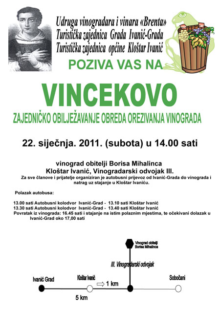 Udruga vinogradara i vinara “Brenta” Ivanić-Grad u suradnji s Turističkog zajednicom Grada Ivanić-Grad i Turističkom zajednicom Kloštar Ivanić i ove godine tradicionalno obilježava blagdan Sv. Vinka – zaštitnika vinogradara.
